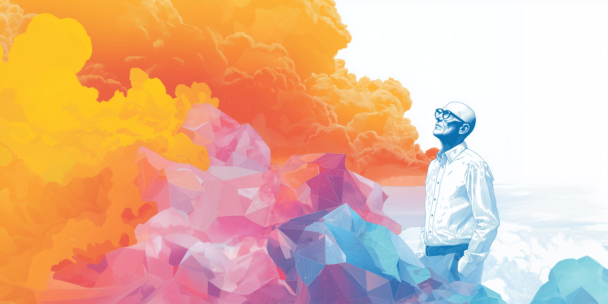Unser gemeinsames Bild – der kahlköpfige Mensch, die orangefarbene Wolke und die kristallinen Formen – ist mehr als eine Illustration.